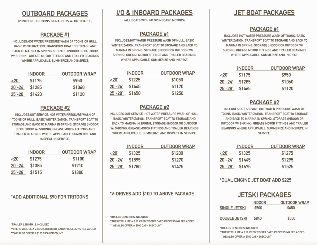 We offer a wide variety of winter services ranging from storage, to cleaning, to winterization and shrink-wrap. Please refer to the images below for a full list of services and prices, and call us with any questions or to schedule an appointment.
